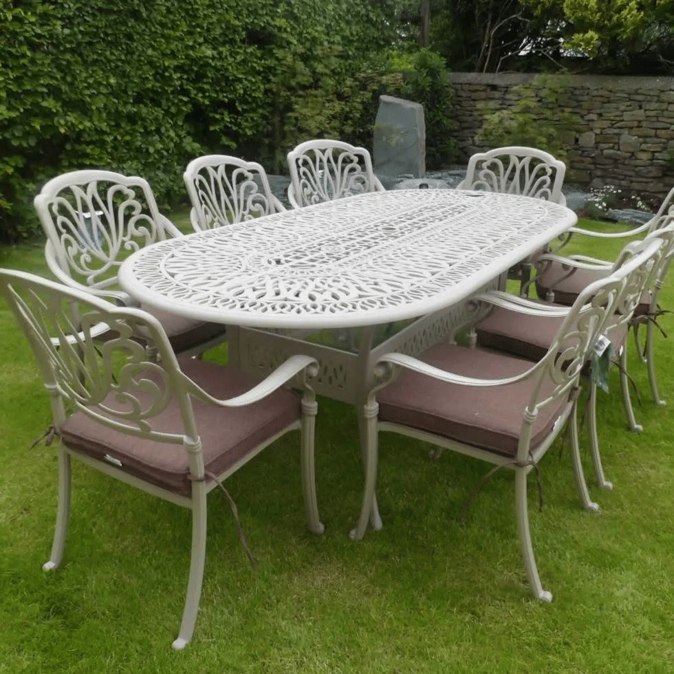Резной овальный стол и удобные кресла позволят с комфортом разместиться за семейным ужином в саду или на открытой террасе вашего дома.