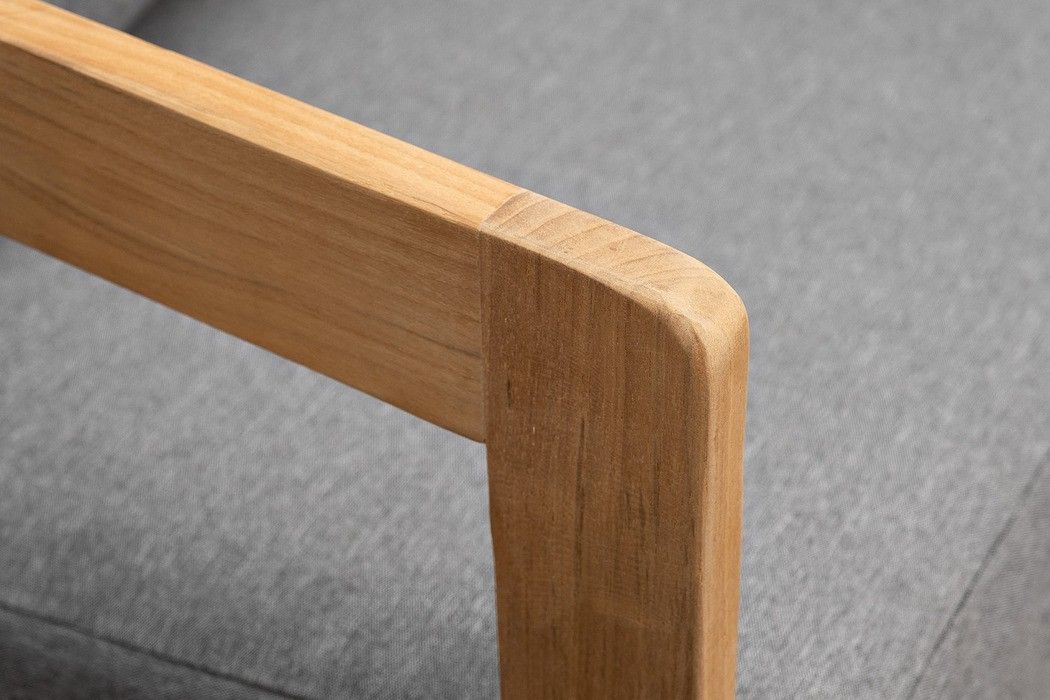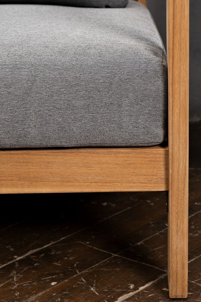 Изготовлен из массива тика и дополнен объемными удобными светло-серыми подушами.