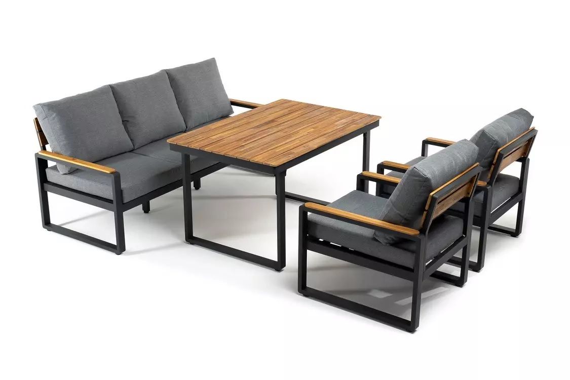 Этот комплект включает в себя удобный диван, обеденный стол и два кресла с мягкими подушками из высококачественного материала Olefin.