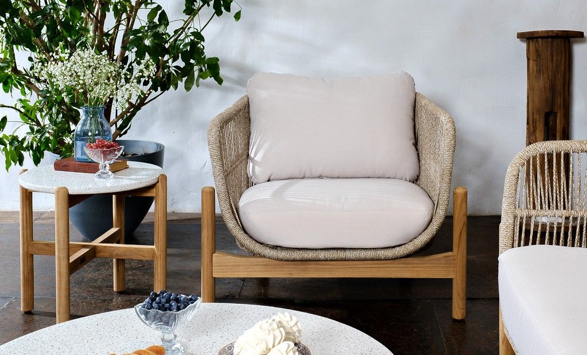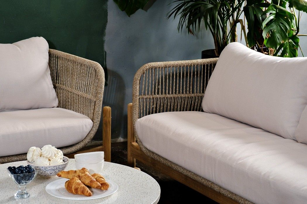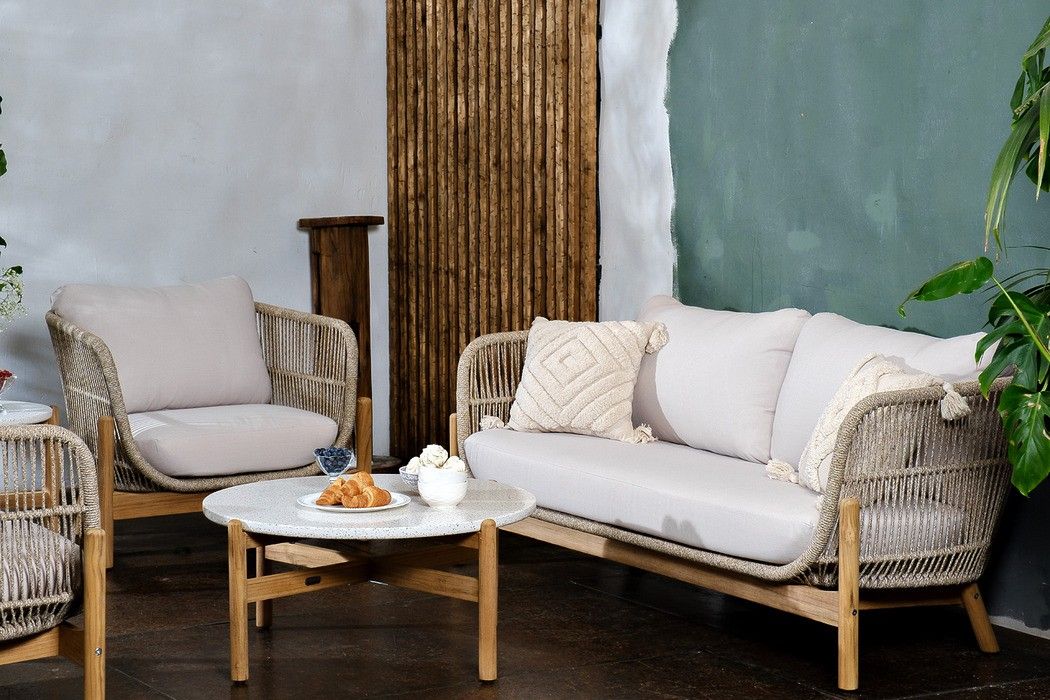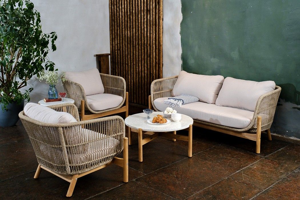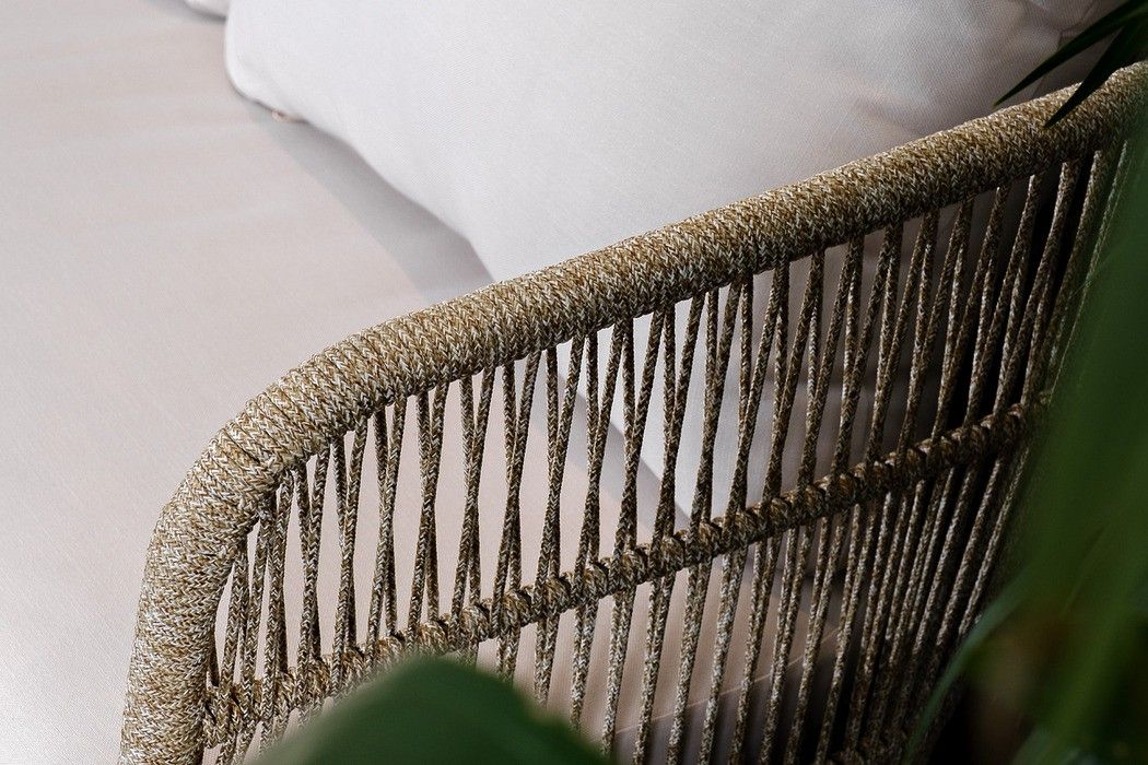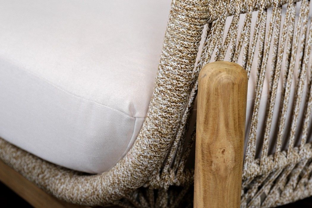 Комплект изготовлен из массива тика с пропиткой экомаслом в комбинации с натуральным веревочным плетением (rope)