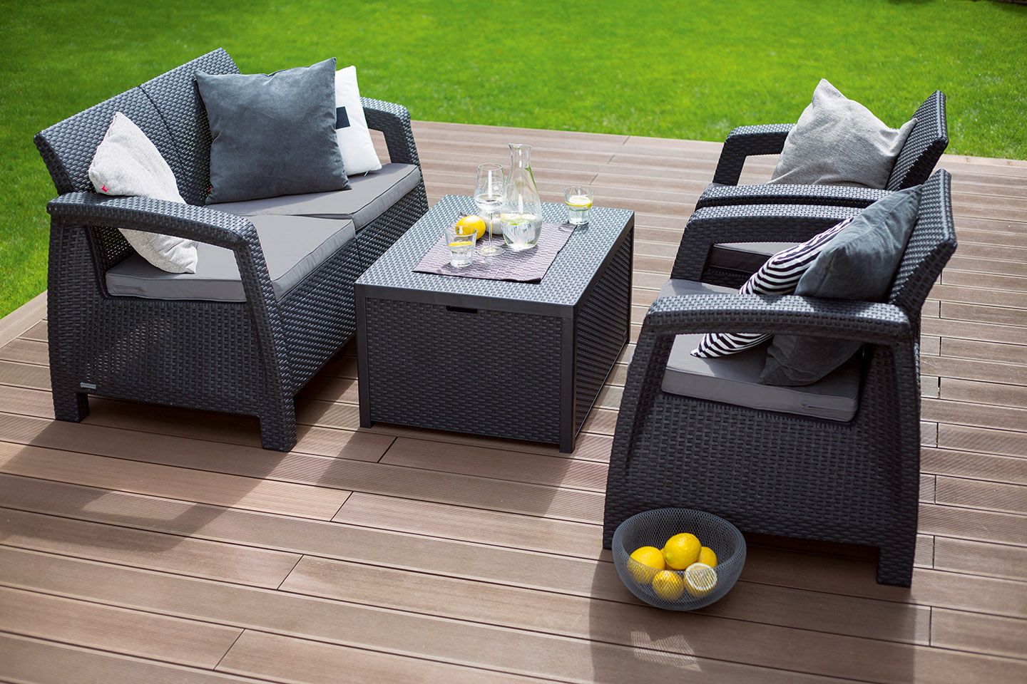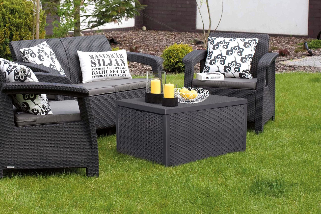 Corfu box - это элегантный мебельный гарнитур с фактурой, напоминающей ротанг, который состоит из двух кресел, двухместного дивана и столика-сундука. Продукт оснащён мягкими подушками сидений. В столе-сундуке всегда можно спрятать вещи от дождя. Мебель с легкой и одновременно устойчивой конструкцией красиво впишется в любое приусадебное пространство, такое как сад или терраса. Набор очень легко чистится. Изготовлен из стойкого к воздействию УФ-излучения пластмассы.