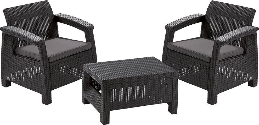 Красота и элегантность в одном наборе. Оптимальные размеры набора позволяют оформлять небольшие садовые и балконные пространства. Комплект состоит из столика и двух кресел с мягкими подушками. Элегантность, удобство и эргономика - это гарантия удовольствия от отдыха на свежем воздухе. Простота сборки и легкость содержания в чистоте - это дополнительные преимущества этой мебели.