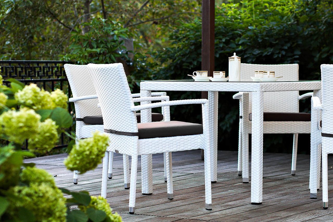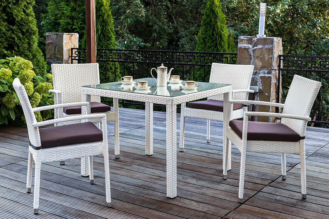 Обеденный комплект садовой мебели на четыре персоны с классическими прямыми линиями.