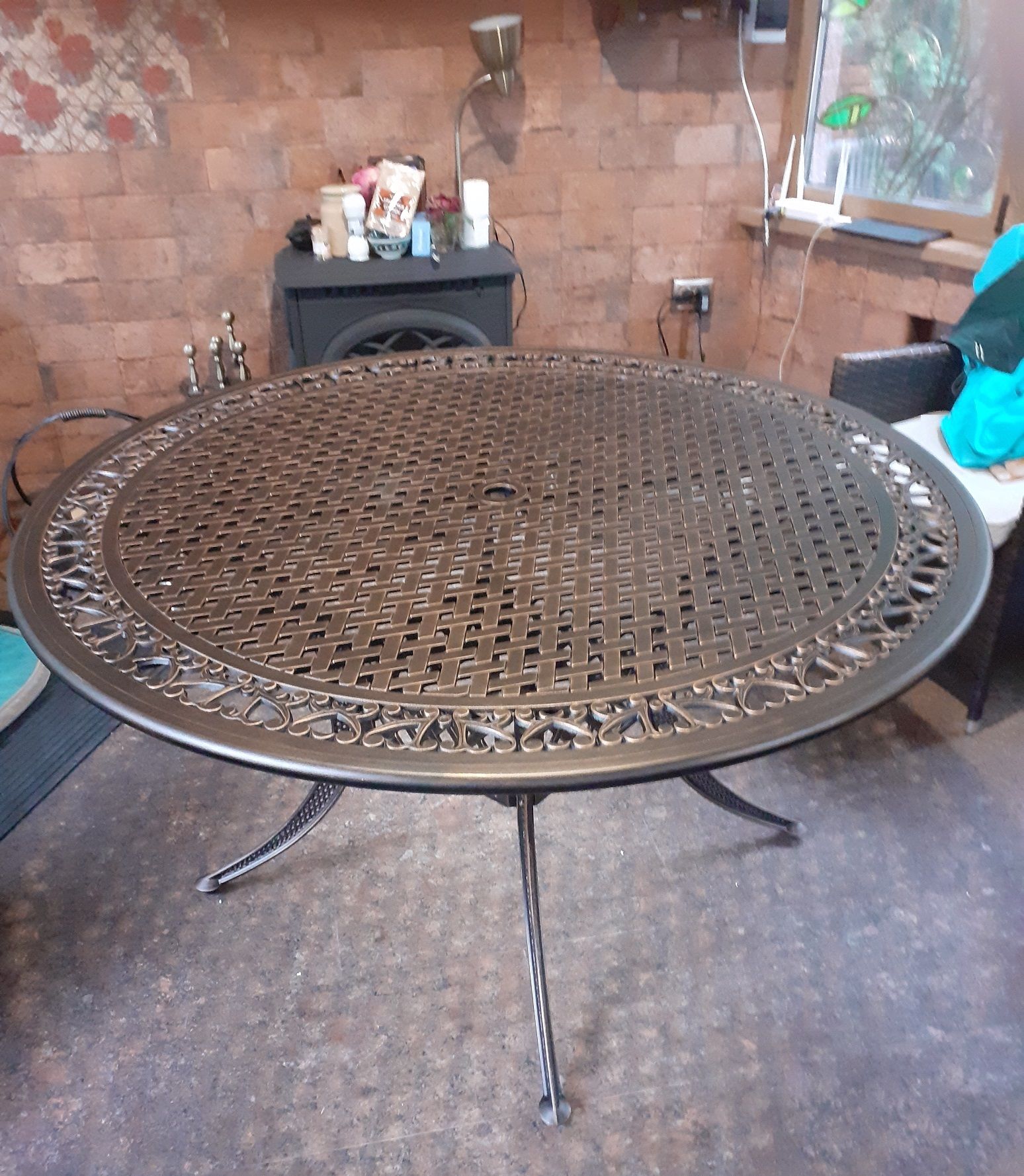 Садовый обеденный стол с диаметром столешницы 137 см. расчитаный на компанию из 6 человек.