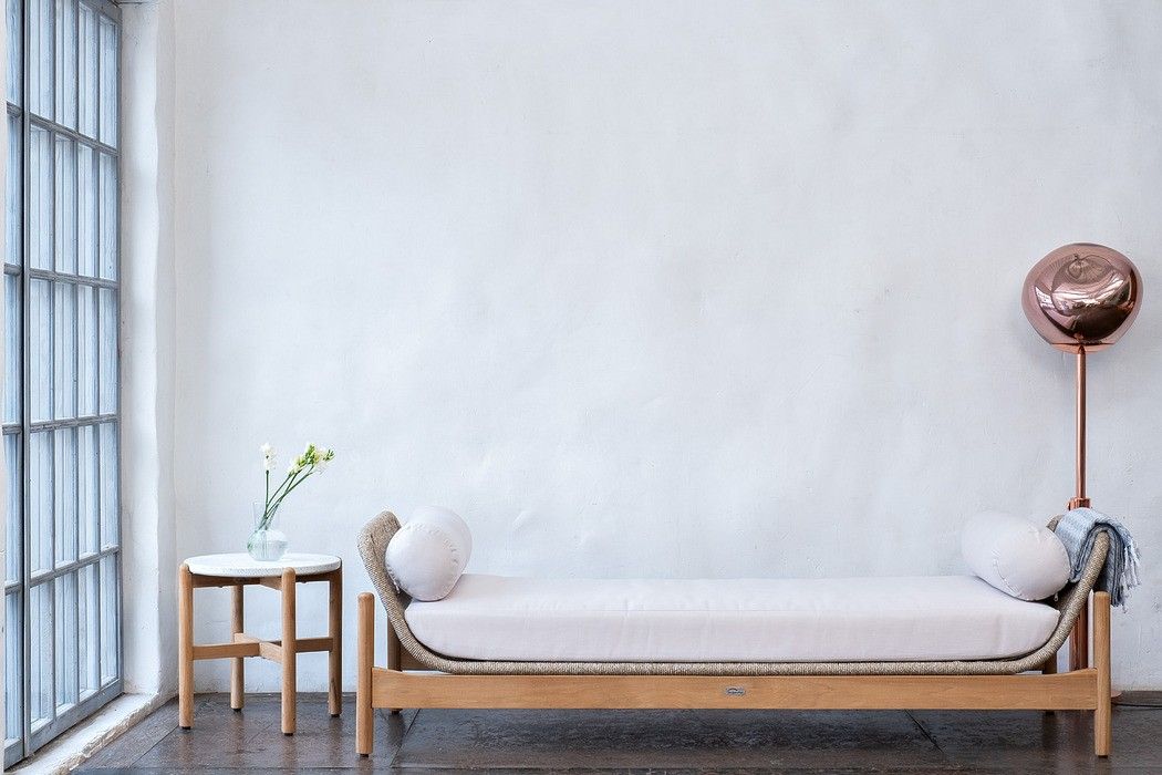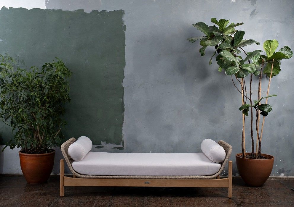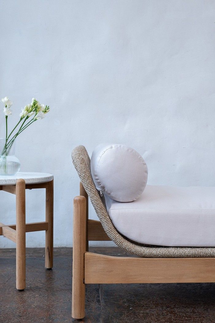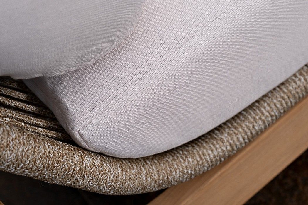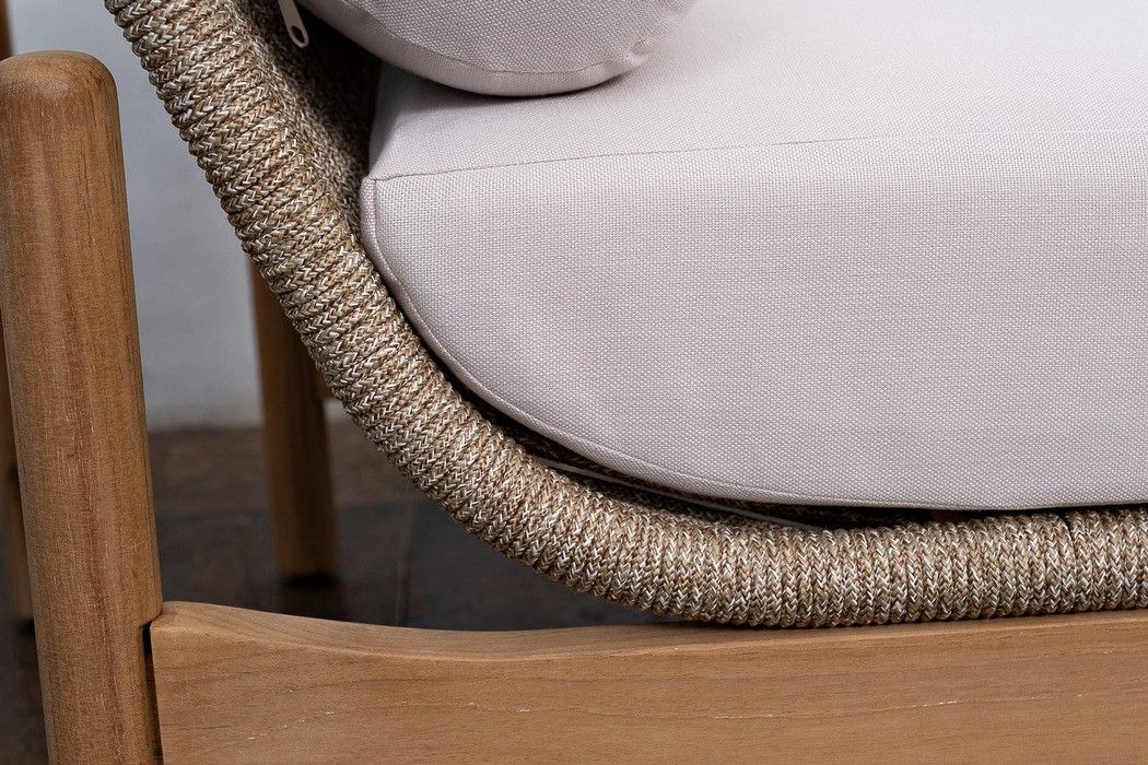 Изготовлена из массива тика в комбинации с веревочным плетением Rope и объемными подушками.