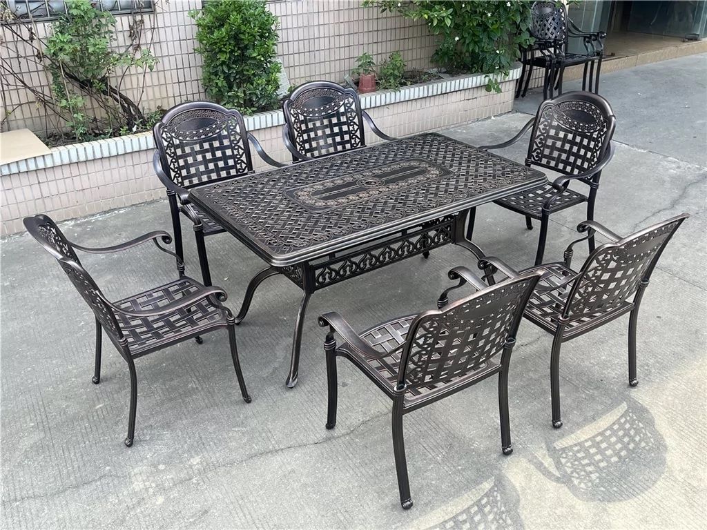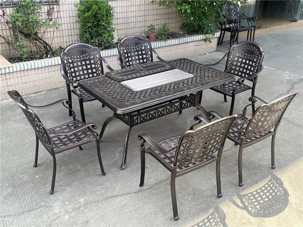 Эта уникальная обеденная группа выполнена из литого алюминия, что обеспечивает ей не только привлекательный внешний вид, но и долговечность.