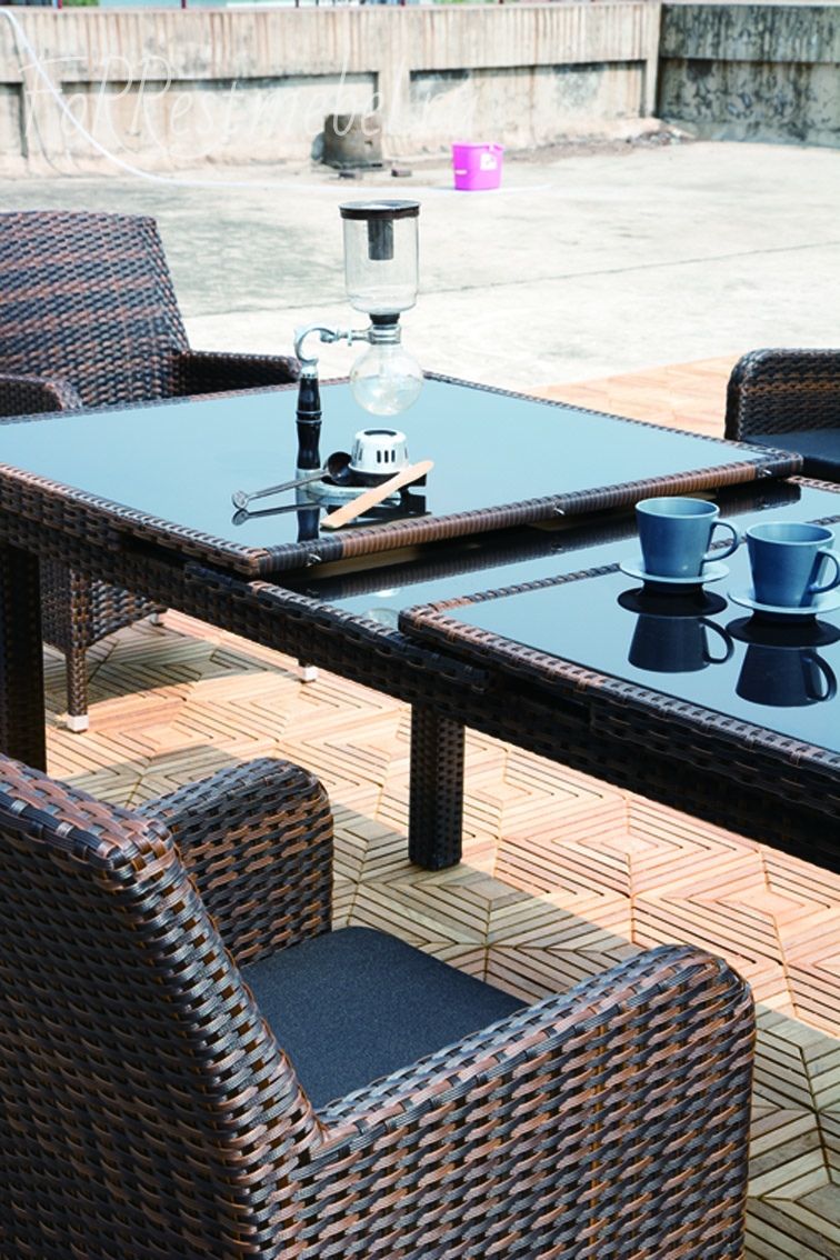 Классическое сочетание темно-коричневого плетения и черной стеклянной столешницы.
