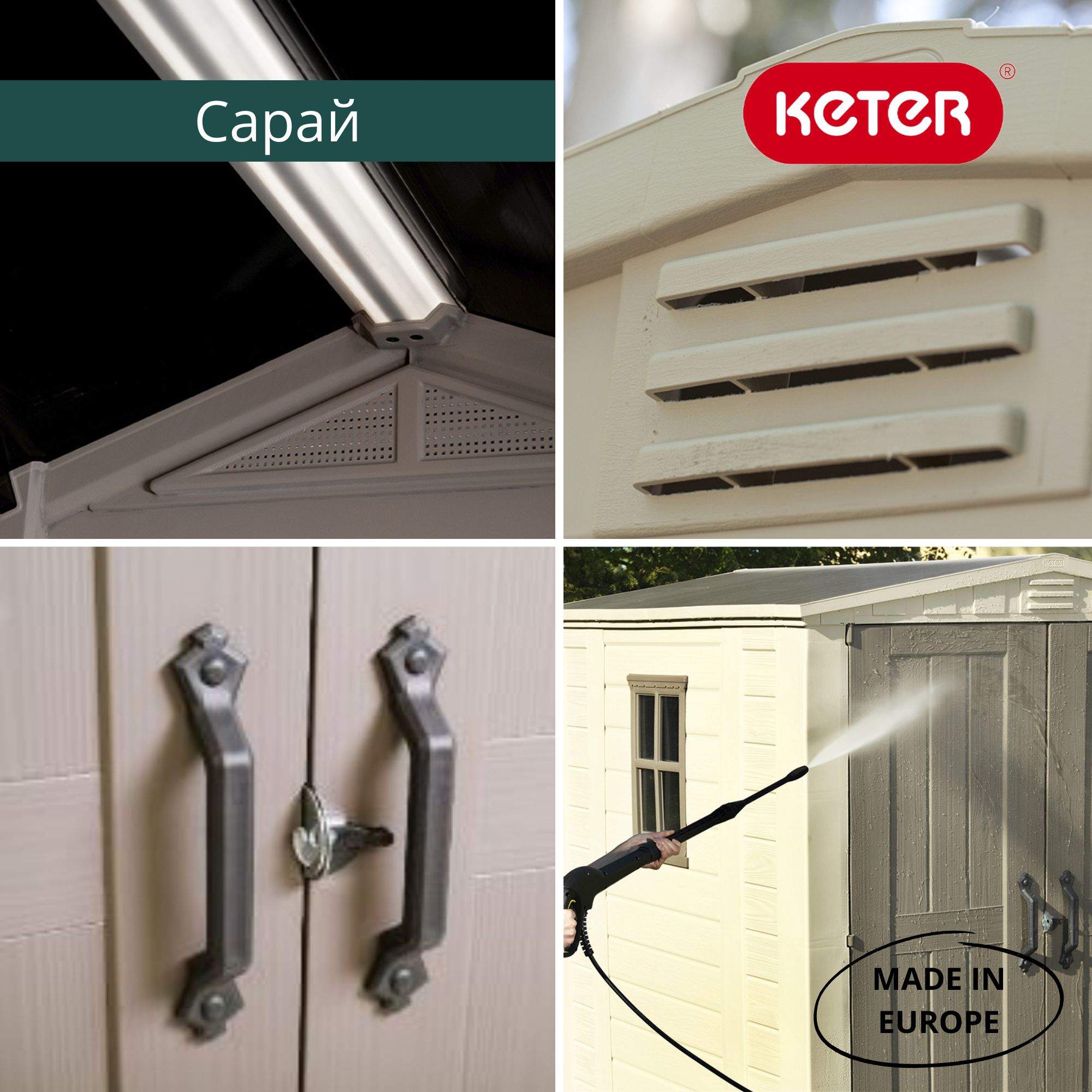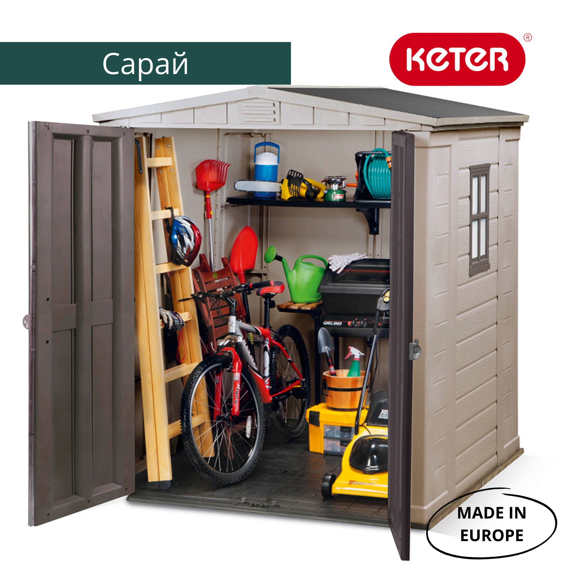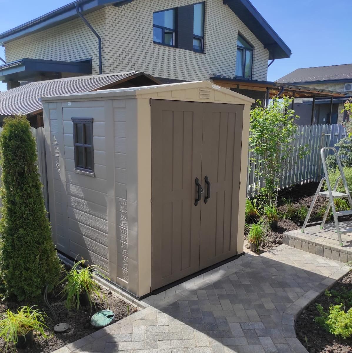 Во вместительном садовом домике Factor 6x6 поместится не только садовый инвентарь, но и небольшое оборудование для отдыха, инструменты и предметы, необходимые в домашнем хозяйстве. Изделие изготовлено из высококачественного пластика, поэтому не требует технического обслуживания, не подвержено процессам коррозии, отслаивания покрытия или гниения материала. Специально усиленная сталью конструкция обеспечивает стабильность и безопасность в использовании. Структура поверхности, напоминающая натуральную древесину, современный дизайн и стильное окно - дополнительные преимущества этого продукта.