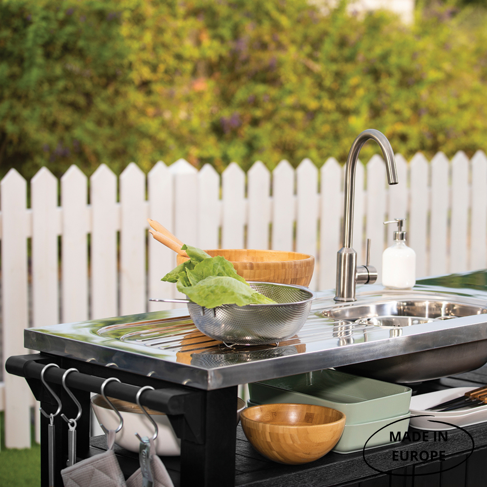 UNITY CHEF - Садовая кухонная столешница с шкафчиками и раковиной – незаменимая мебель для садовой вечеринки или барбекю. Укрепленная столешница из нержавеющей стали и встроенная раковина. Компоненты подачи и отвода воды: фитинг для садового шланга, фильтр и шланг 90 см/3’. Закрываемые шкафчики и исключительно большая полка. Ножки с регулированием высоты. Ручка из нержавеющей стали, держатель для бумажного полотенца, 4 крючка и открывашка для бутылок. Прочная конструкция из пластика, не требующая ухода. Легкий монтаж, легкое пользование, легкая чистка.