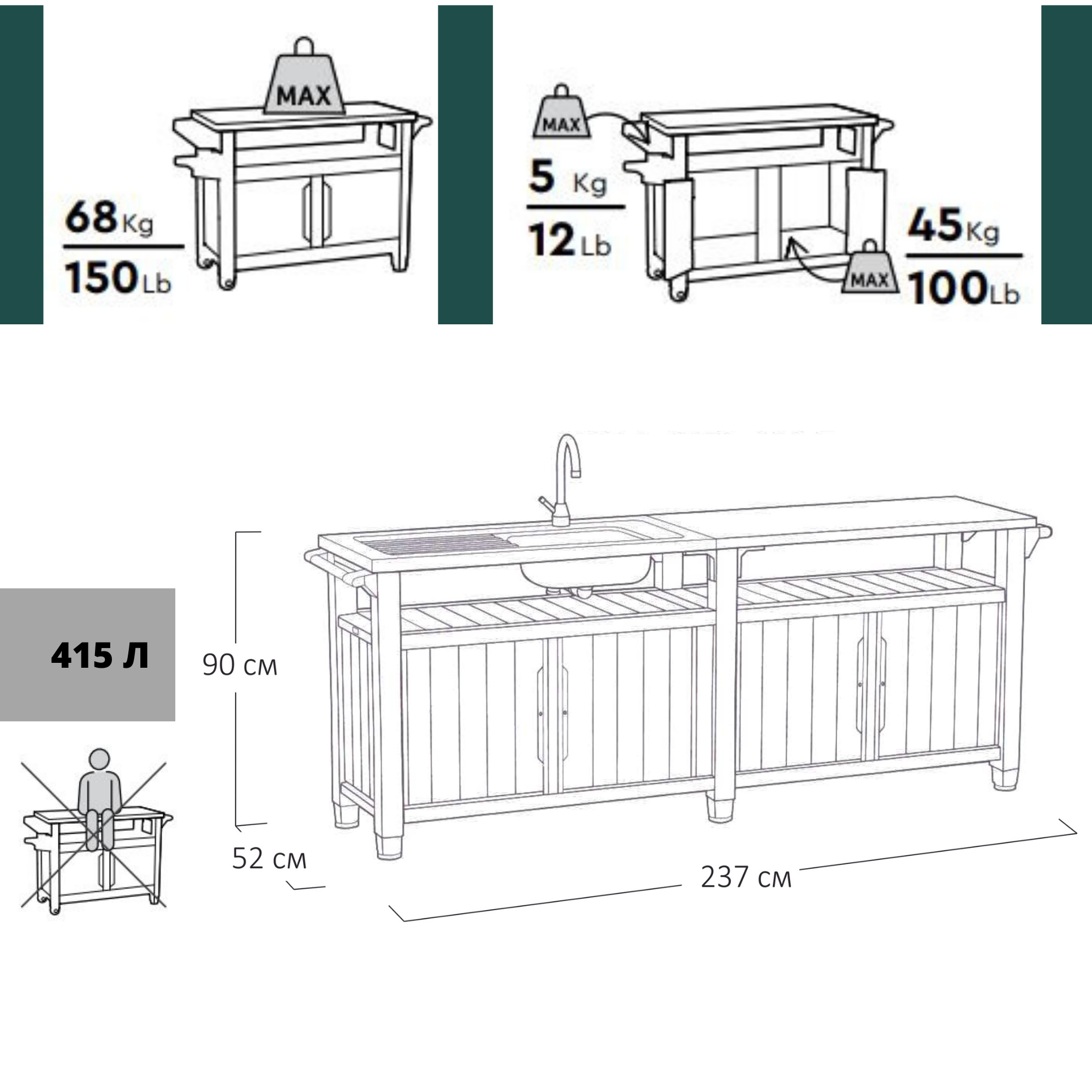 Вместимость415 лВысота90 смГлубина52 смШирина237 смПроизводительKeterОсновной материалПластик