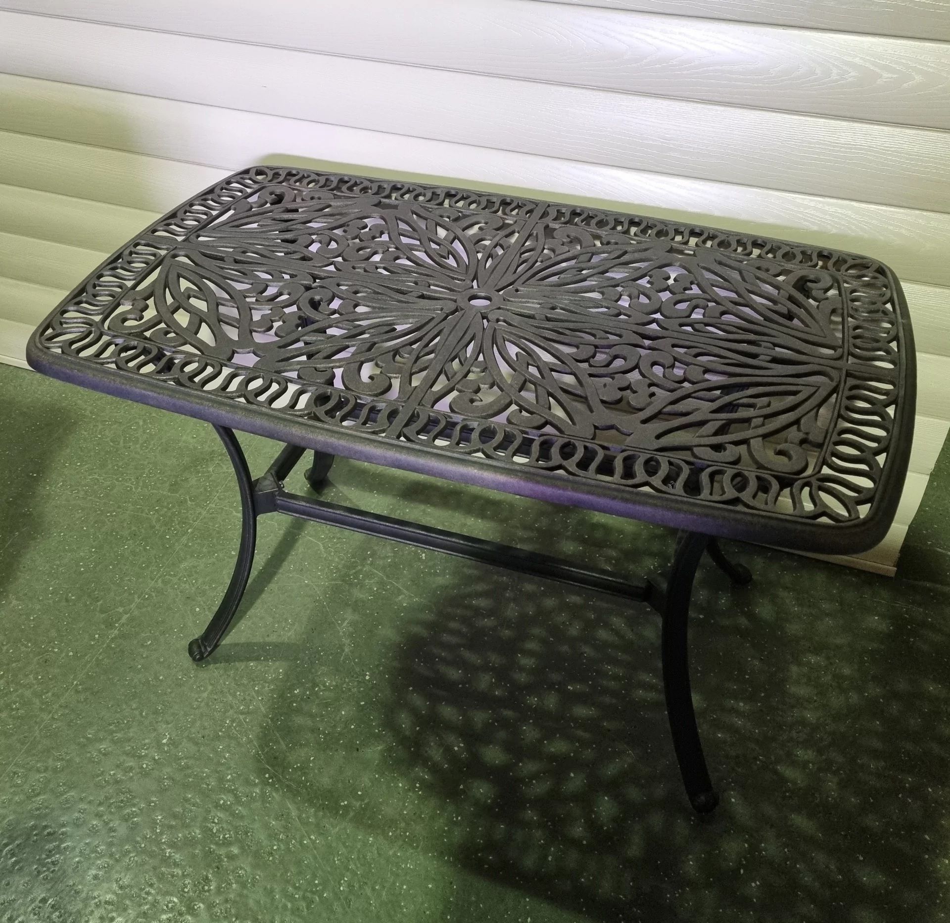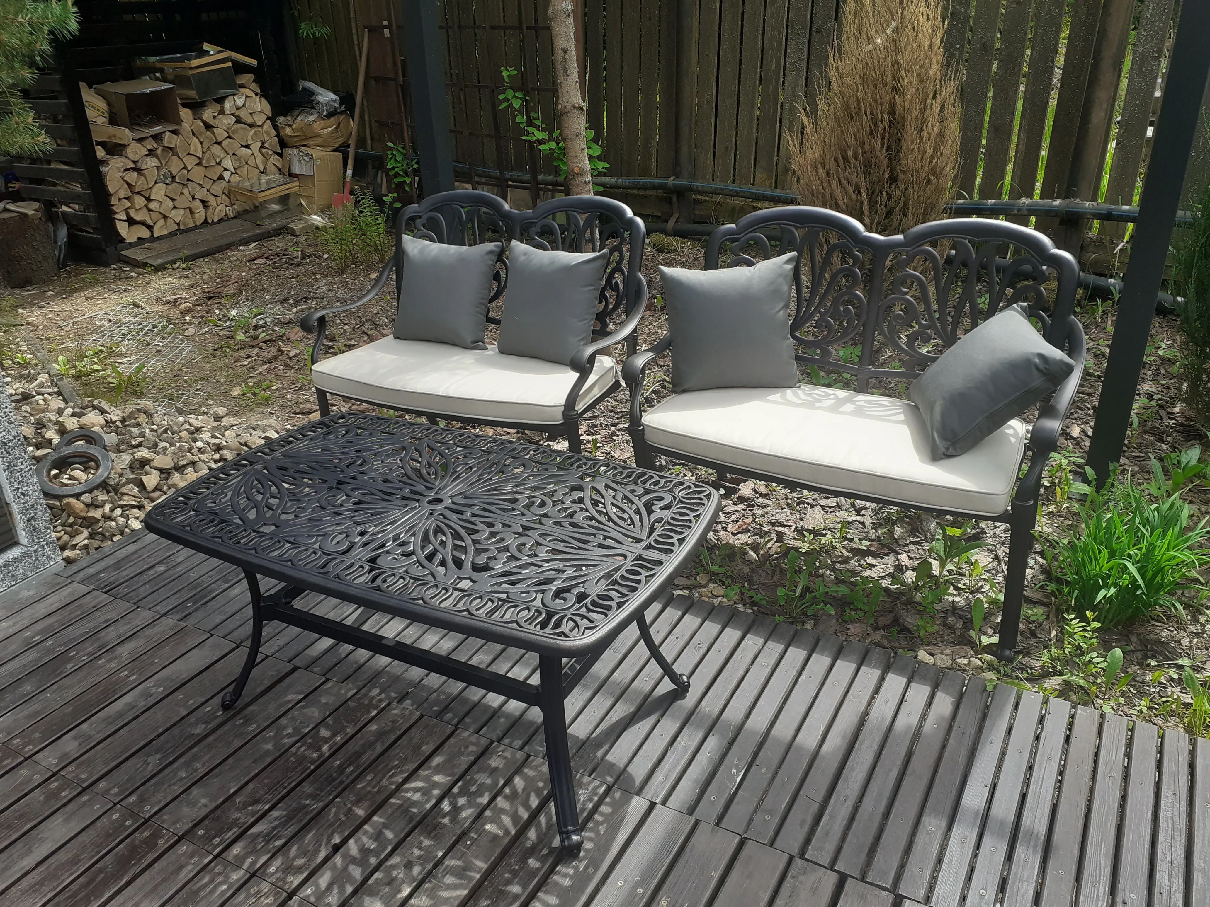 Мебель из литого алюминия не боится осадков, перепадов температур, а так-же не требует особого ухода.